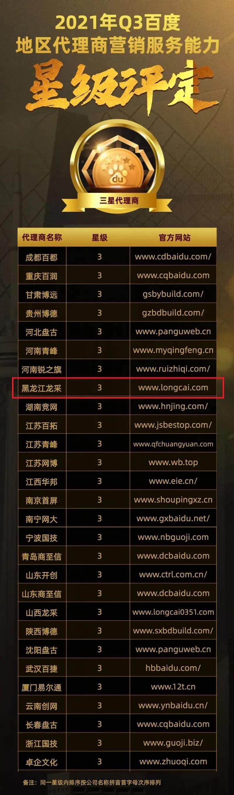 經(jīng)百度認(rèn)證評(píng)選團(tuán)的層層篩選,2021年Q3百度地區(qū)代理商營(yíng)銷服務(wù)能力星級(jí)評(píng)定結(jié)果已經(jīng)出爐。黑龍江龍采以優(yōu)異的專業(yè)能力、創(chuàng)新的實(shí)踐能力以及廣告主高分滿意度榮獲“三星”代理商稱號(hào)!